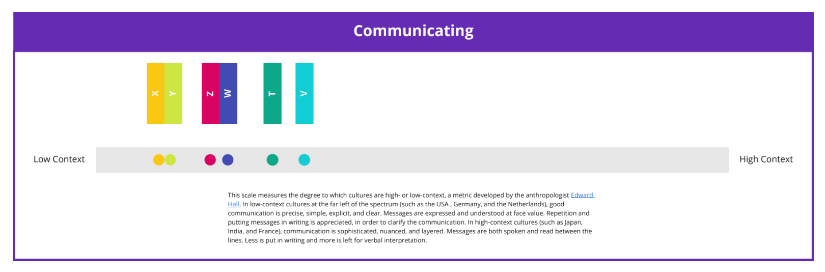 Communicating (Low context to high context): This scale measures the degree to which cultures are high- or low-context, a metric developed by the anthropologist Edward Hall. In low-context cultures at the far left of the spectrum (such as the USA , Germany, and the Netherlands), good communication is precise, simple, explicit, and clear. Messages are expressed and understood at face value. Repetition and putting messages in writing is appreciated, in order to clarify the communication. In high-context cultures (such as Japan, India, and France), communication is sophisticated, nuanced, and layered. Messages are both spoken and read between the lines. Less is put in writing and more is left for verbal interpretation.