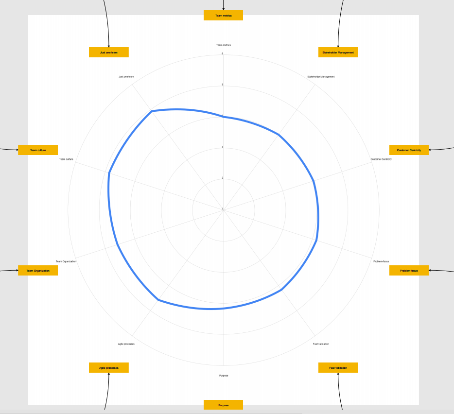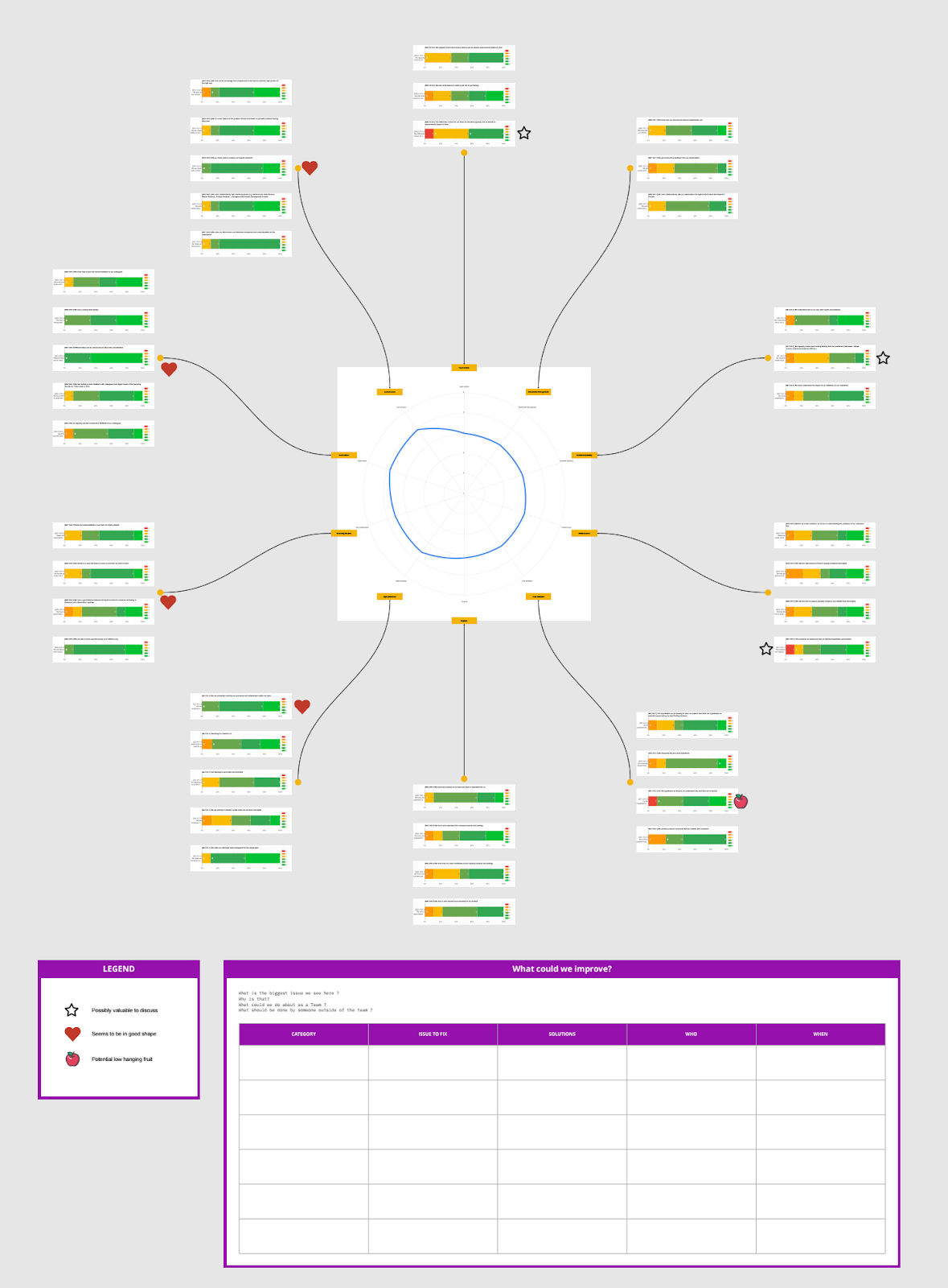 Each of the categories has a score that is calculated by the average score of all the questions that belong to the category. This chart acts as a team radar. A commonly used practice in visual management. A small but important detail is that the exact number of the average is not displayed. That is made on purpose because if you give the exact score, you could give the feeling of accuracy. The score is meaningless by itself. What is important is how the team interprets it and serves as a trigger for an improvement, not as an end goal.