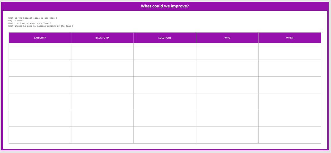 The improvement matrix. Where the team chooses the category to work on, the issue to fix, the possible solutions or experiments, and who or when