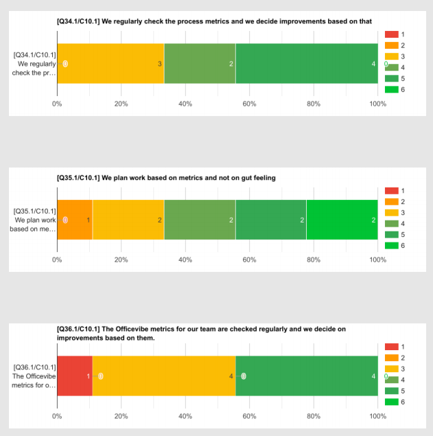 These charts represent the distribution between the answers to each question. For example, on the question āWe regularly check the process metrics and we decide improvements based on thatā there were 3 people that voted 3 out of 6, 2 people that voted 4 out of 6, and 4 people that voted 5 out of 6.